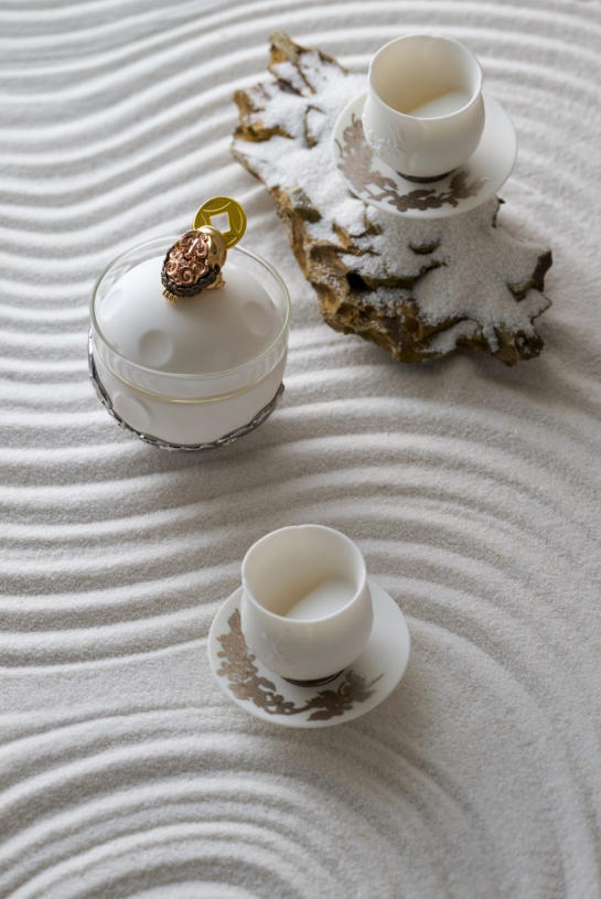 茶具的核心设计围绕“月”展开:当茶汤注入白瓷杯时,杯内会依次显现“新月→峨眉月→上弦月→盈凸月→满月”的动态变化,既呼应了中秋“月满人和”的核心意象,也让“圆满”的祈愿从抽象变为具象。在品茗时,能直观感受到中秋的时序之美,让日常使用也充满节日仪式感。