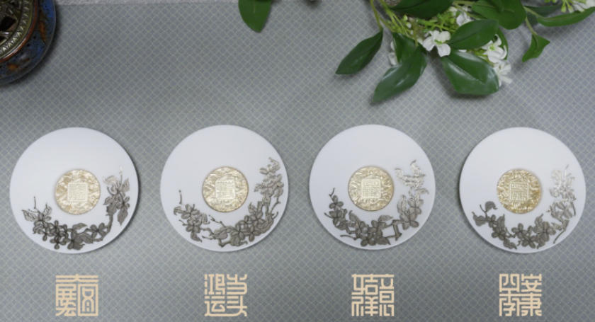 公道杯顶部的金蟾造型更是点睛之笔。作为“月宫三吉”之一,金蟾承载着“金蟾献瑞、财源广进”的传统祝福,其口衔的磁吸式钱币可取下把玩,增添互动趣味;茶杯杯身浮雕的桂花、杯碟的桂枝与金蟾呼应,暗合“蟾宫折桂”的美好寓意,有“事业顺遂、前程锦绣”的现代内涵,适配商务馈赠与亲友礼赠的情感需求。此外,杯碟底部刻印的“大展宏图”“鸿运当头”“吉祥如意”“四季安康”四组合体字,以传统文字艺术传递多重祝福,让礼盒的文化底蕴更显厚重。
